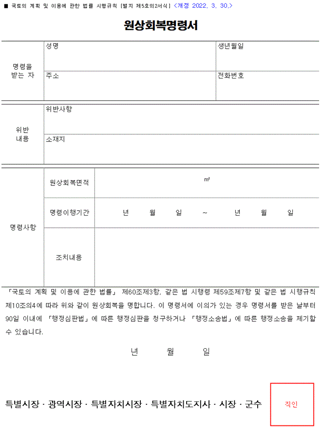원상회복을 명하는 경우에는 구체적인 조치 내용.기간 등을 정하여 서면으로 통지해야 합니다.