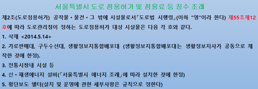 도로법 시행령 제55조, 각 지자체 조례로 점용허가를 받을 수 있는 공작물 등의 종류가 열거되어 있습니다.