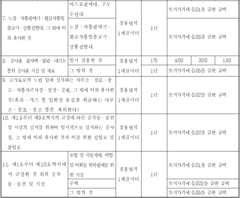 ● 점용료의 산정 기준(도로법 시행령 제69조)