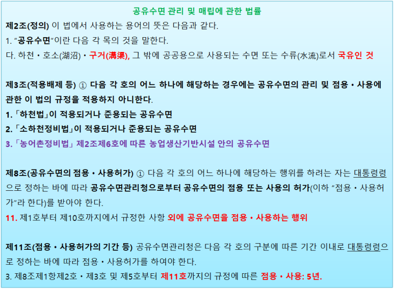 그러면서 하천법.소하천정비법이 적용 or 준용되는 공유수면은 이 법의 규정을 적용하지 않습니다.