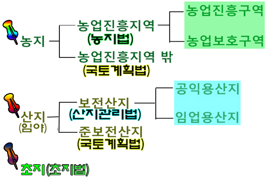 ● 농림지역 중 농업진흥지역(농업진흥구역,농업보호구역)은 농지법, 보전산지(공익용산지.임업용산지)는 산지관리법에 의한 별도의 행위제한을 받게 됩니다.
