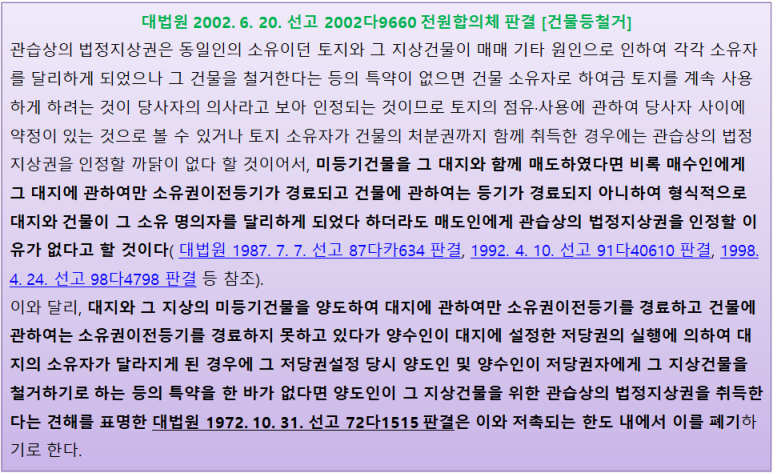 또한 낙찰자C의 입장에서도 소송을 통하여 B에게 지상 건물의 철거를 구할 경우 오랜 시일이 걸리므로 기회비용의 상실과 많은 에너지가 소모되겠죠