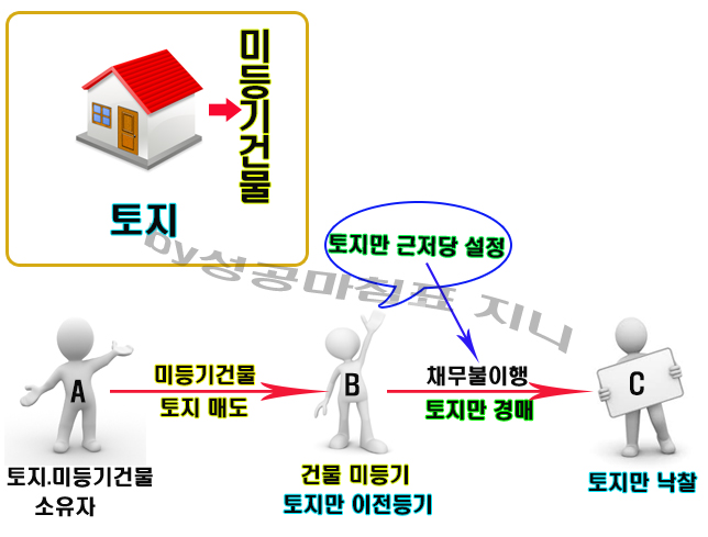 B는 토지와 건물을 모두 매수하여 이를 인도받아 사용하고 있지만 건물은 미등기인체로 두었고 토지에 대하여만 그 소유권이전등기를 경료하였기에 B가 은행에 근저당을 설정할 당시에 건물의 소유권은 여전히 A에게 있었는데 이러한 경우 B의 지상건물에 민법 제366조 법정지상권 또는 관습법상 법정지상권이 성립하는지 문제가 됩니다.