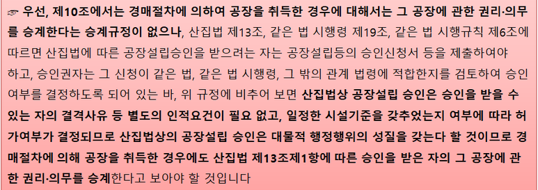 산집법 제10조에 따라 기존 공장에 대한 권리.의무를 승계받은 경우 이는 산집법 및 관계볍령상 발생한 권리 의무를 승계하는 것일 뿐이어서 공장설립 등에 제공되던 공장 진입로와 관련한 제3자에 대한 권리 의무까지 당연히 승계된다고 할 수 없을 것이고 건축법 제44조 건축물의 대지는 2m이상이 도로에 접해야 한다는 규정이 있어 건축법상 건축허가시 공장 진입로 확보여부를 판단하여야 하나 건축법상 건축허가를 받거나 건축허가를 의제받는 것은 건축법에 따라 발생하는 권리.의무일 뿐 산집법상의 권리.의무라고 할 수는 없다 할 것이므로 해당 공장 진입로에 대해 산잡법상 어떠한 권리.의무가 발생했다고 볼 수는 없습니다.