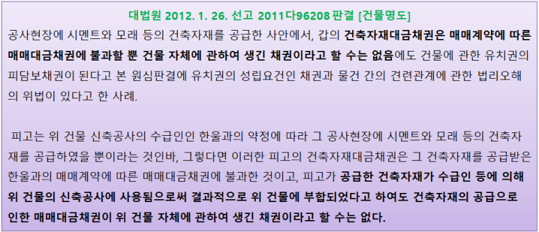 대법원도 "건축자재대금채권은 건물신축공사 수급인과의 매매계약에 따른 매매대금채권에 불과할 뿐 건물 자체에 관하여 생긴 채권이라고 할 수 없다고 판시하고 있습니다.