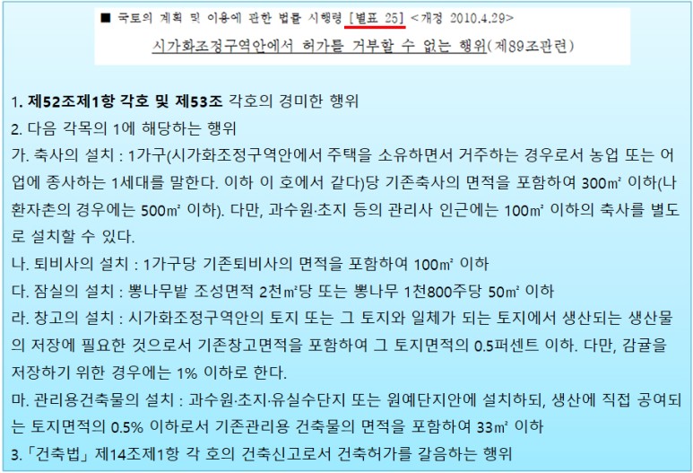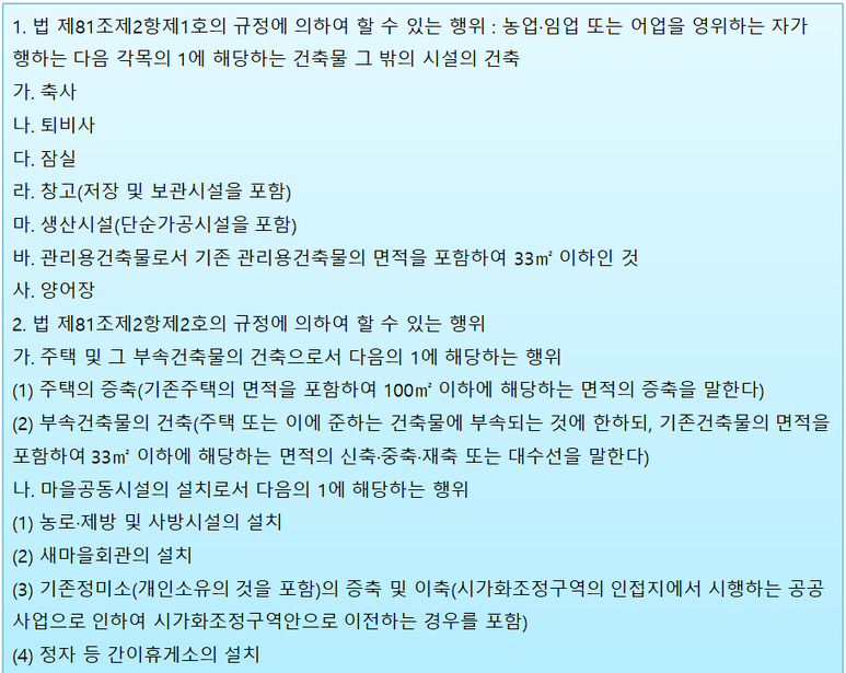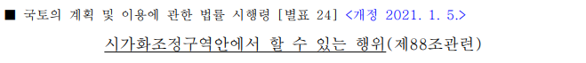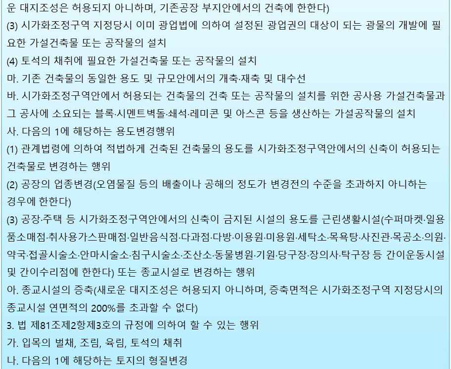 ○ 시가화조정구역 개발 건축 행위제한(국토계획법 시행령 제88조)