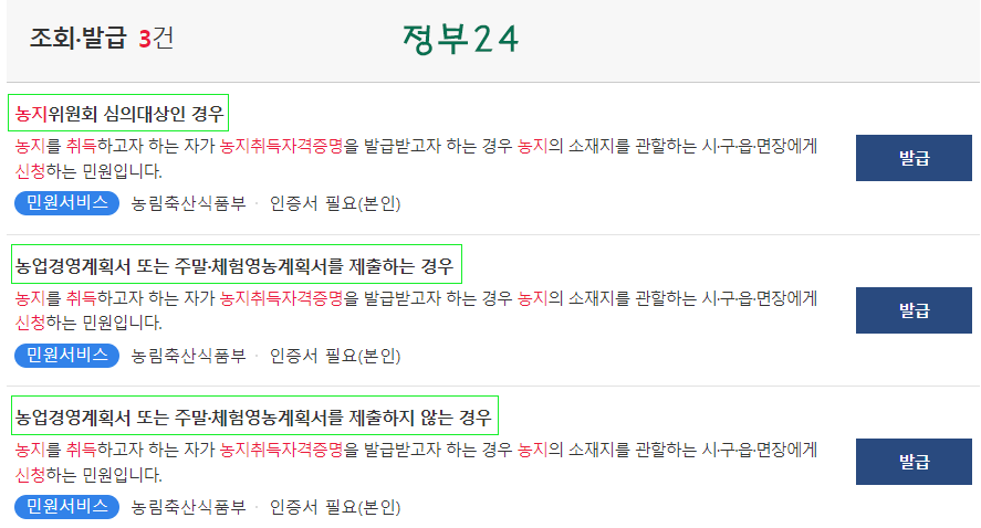 "정부 24"에서 인터넷 온라인상으로도 농취증 신청. 접수가 가능합니다.