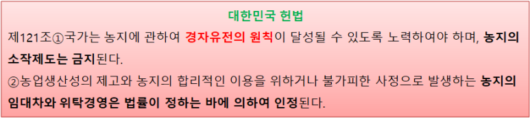 헌법의 "경자유전의 원칙"과 농지법 제6조제1항에 따라 농지는 농업인과 농업법인만이 자기의 농업경영, 즉 자기의 계산과 책임하에 농업을 영위하는 경우가 아니면 원칙적으로 농지를 소유할 수 없습니다.