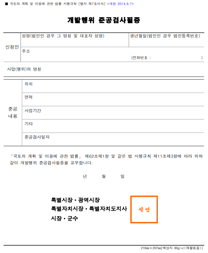 ● 개발행위준공검사필증.(국토계획법 시행규칙 제11조)