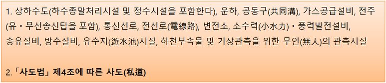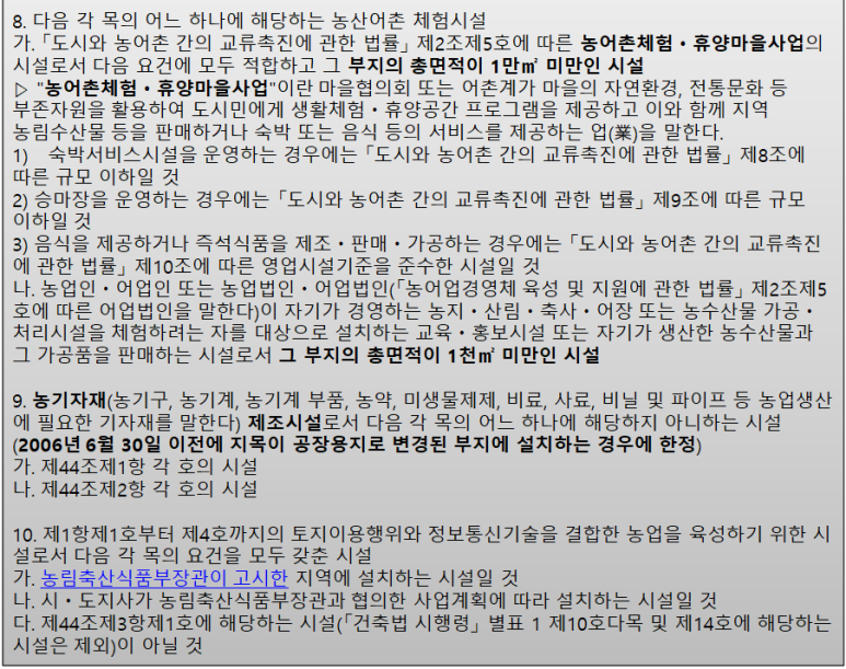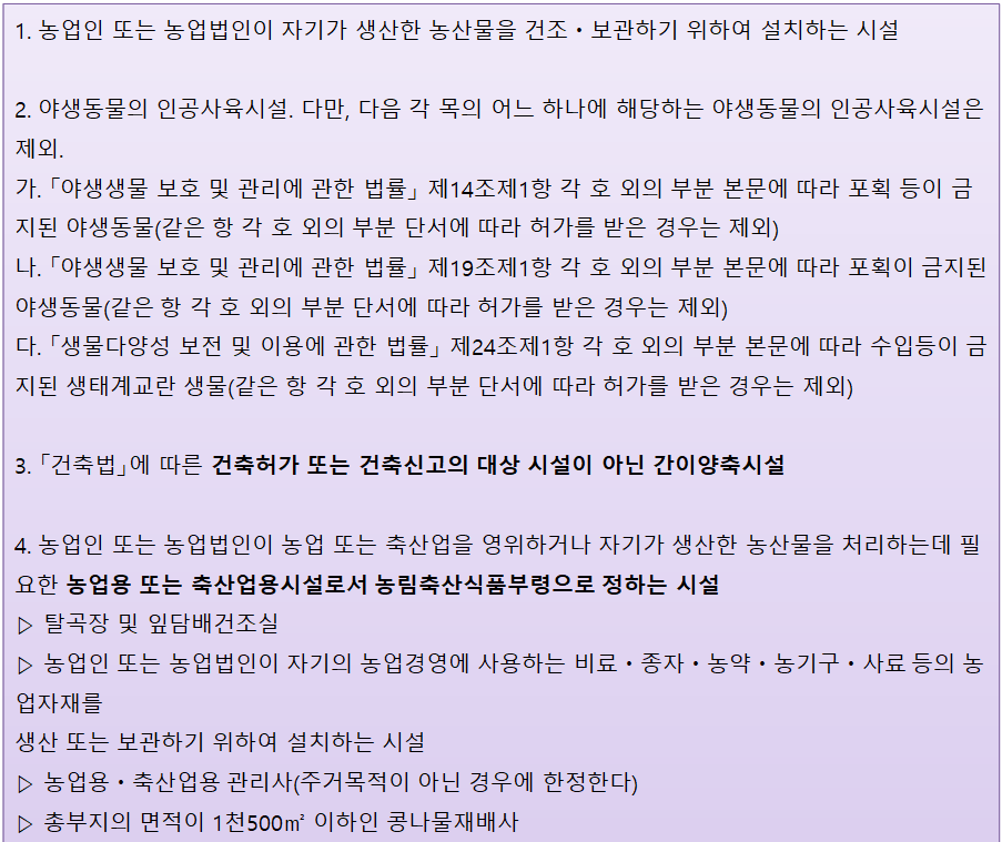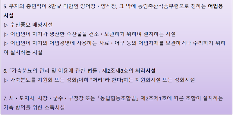 ⑤ 농업용 시설.축산업용 시설. 어업용 시설![]() ![]() 위 제1호 및 제4호의 시설은 자기의 농업 또는 축산업의 경영의 근거가 되는 농지ㆍ축사 등이 있는 시ㆍ구ㆍ읍ㆍ면 또는 이에 연접한 시ㆍ구ㆍ읍ㆍ면 지역에 설치하는 경우로 한정 |