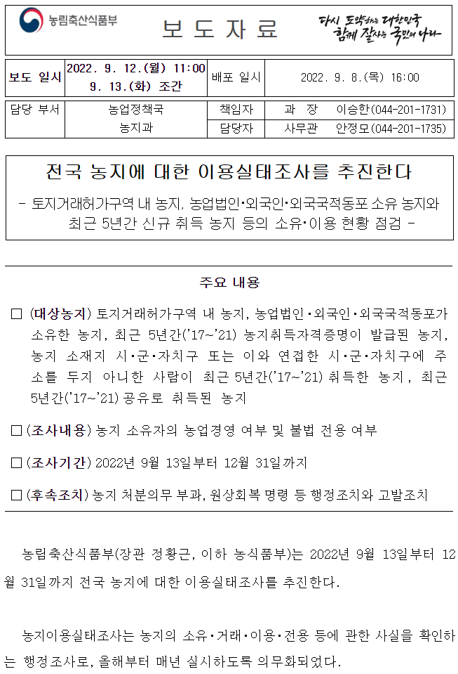 이번 포스팅은 농지의 사후 관리 수단인 농지이용실태조사에 대해 알아보겠습니다.