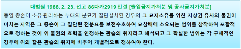 따라서 집단분묘의 경우 그 곳에 있는 전체의 분묘를 보전.수호.묘 참배에 소요되는 필요한 범위에 미친다고 할 것입니다.
