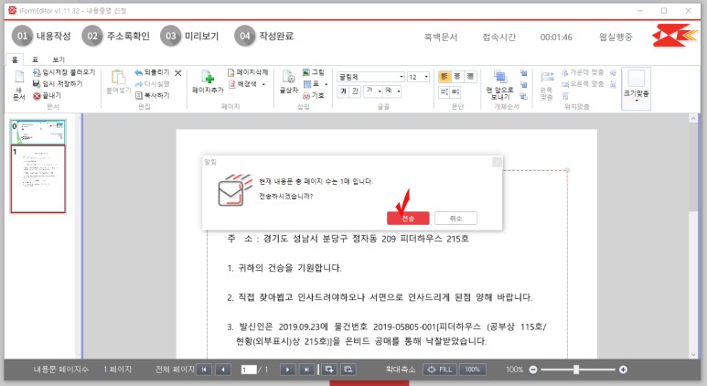 발송문서 수령 선택시 작성한 문서를 우편으로 받을 수 있으나 본인 컴퓨터에서 출력 가능하고 추가 요금이 발생하기에 굳이 할 필요는 없습니다.