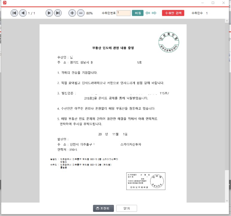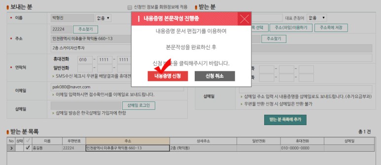 작성된 내용증명은 수신인에게 1통 발송하고 1통은 발신인, 나머지 1통은 우체국에서 보관합니다.