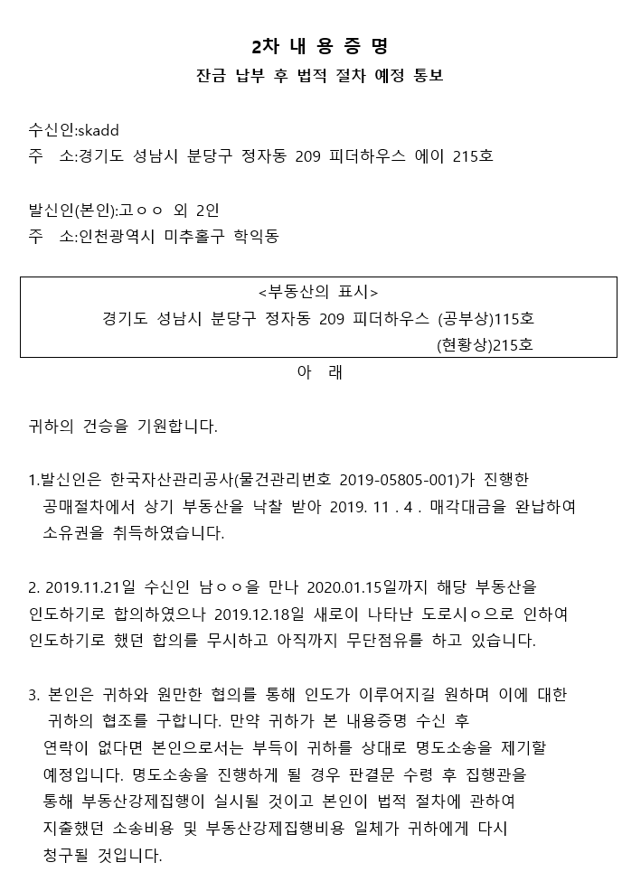 이 사안은 이전 포스팅에서 낙찰받았던 물건인데 그 때 보냈던 내용증명입니다.