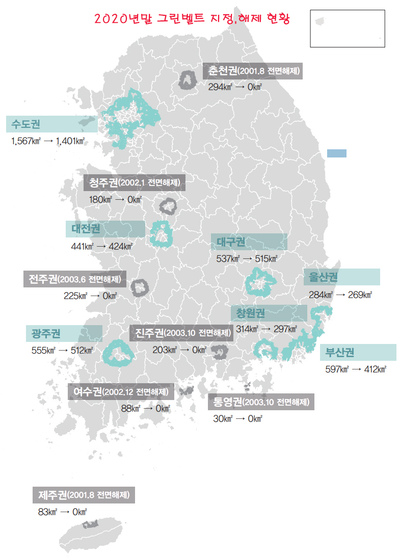 또한, 충무는 관광도시로서의 자연환경보호를 목적으로, 여천은 신흥공업도시로서 공업단지와 도시지역을 차단함으로서 도시팽창을 억제하고 대기오염확산도 방지하기 위하여 73년 6월 지정,1977년 여수권에 이르기까지 총 8차에 걸쳐 전국 14개 도시권에 총 5,397.1㎢(전국토의 5.4%)의 개발제한구역 그린벨트를 지정하였으며 이 후 개발제한구역의 신규 지정은 없기에 지정 기준은 참고로 가볍게 이해하시고 우리가 관심을 가져야 할 부분은 개발제한구역 그린벨트의 해제입니다.