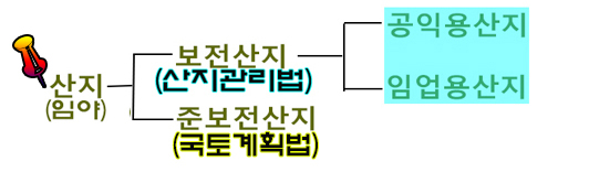 산지는 보전산지와 준보전산지로 나뉘고 보전산지는 다시 공익용산지와 임업용산지로 세분 됩니다.