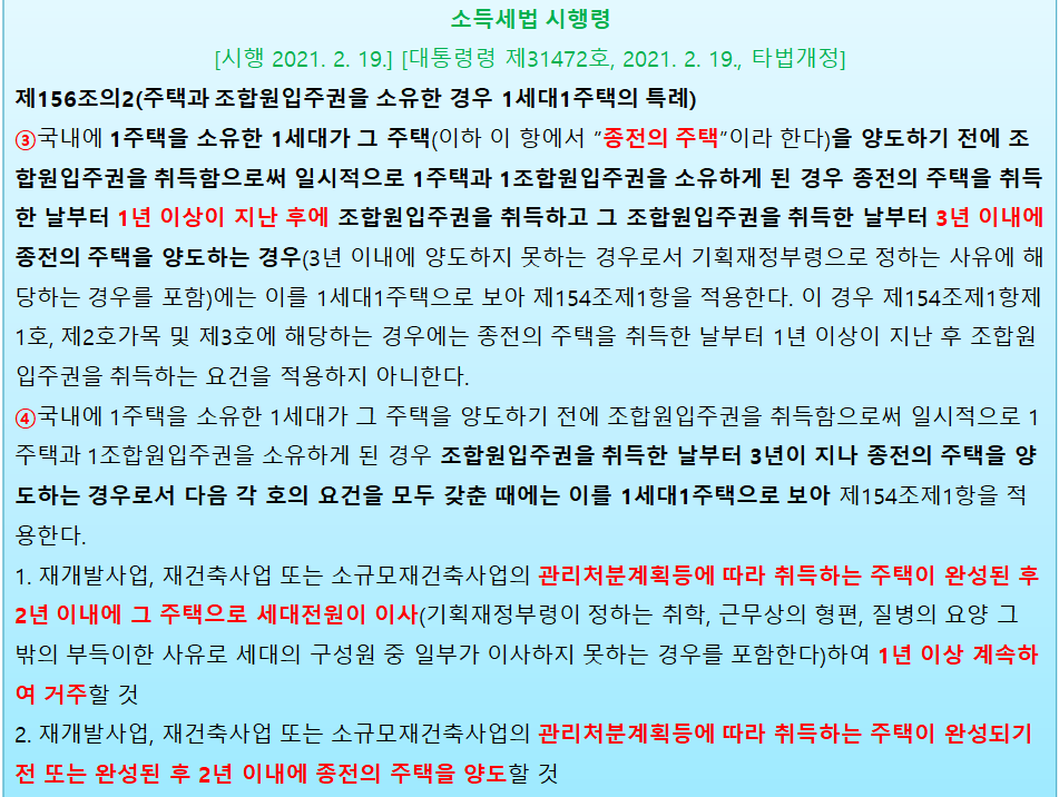 - 관리처분계획에 따라 취득하는 주택(새아파트)이 완성된 후 2년이내에 그 주택으로 세대원 전원이 이사하여 1년 이상 거주할 것