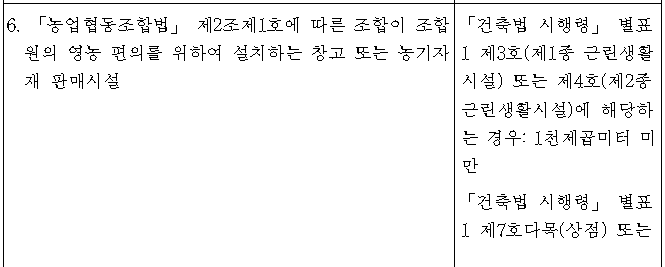 | 1. "농어촌정비법" 제2조제16호나목에 따른 관광농원사업으로 설치하는 시설로서 농업보호구역안의 부지면적이 2만㎡ 미만인 것 ▷ 관광농원사업 농어촌의 자연자원과 농림수산 생산기반을 이용하여 지역특산물 판매시설.영농 체험시설.체육시설.휴양시설.숙박시설.음식 또는 용역을 제공하거나 그 밖에 이에 딸린 시설을 갖추어 이용하게 하는 사업 2. "농어촌정비법"제2조제16호다목에 따른 주말농원사업으로 설치하는 시설로서 농업보호구역안의 부지면적이 3천㎡ 미만인 것 ▷ 주말농원사업 주말영농과 체험영농을 하려는 이용객에게 농지를 임대하거나 용역을 제공하고 그 밖에 이에 딸린 시설을 갖춰어 이용하게 하는 사업 3. 태양에너지 발전설비로서 농업보호구역안의 부지면적이 1만㎡ 미만인 것 4. 그 밖에 농촌지역 경제활성화를 통하여 농업인 소득증대에 기여하는 농수산업 관련시설로서 농림축산식품부령으로 정하는 시설 ![]() ![]() ![]() |
