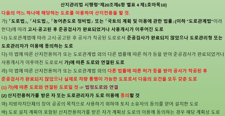 결론은 법정(건축법상)도로와 이를 연결하기 위한 절.성토사면을 제외한 유효너비 3m이하, 그 길이가 50m이하인 진입로만을 보전산지인 공익용.임업용산지에 설치할 수 있다는 것