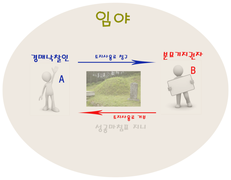 A가 경매를 통하여 임야 지분일부를 취득한 후 B에게 토지사용료(지료)를 정구하였으나 B는 분묘기지권을 취득했으니 지료를 낼 수 없다고 맞선 사안압니다.